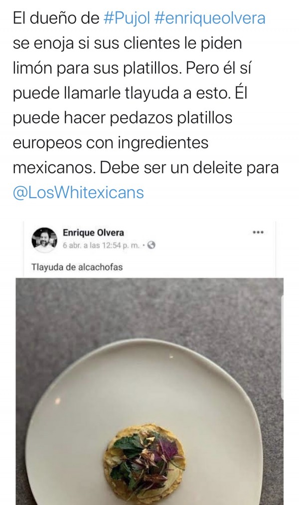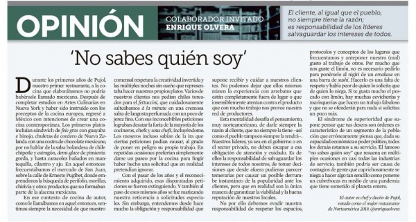 En el texto “No saben quién soy”, que fue publicado en el periódico Reforma, Olvera dejó entrever su molestia con los clientes que no respetan “la creatividad invertida y las múltiples noches sin sueño” que requiere elaborar los platillos de la cocina de autor.