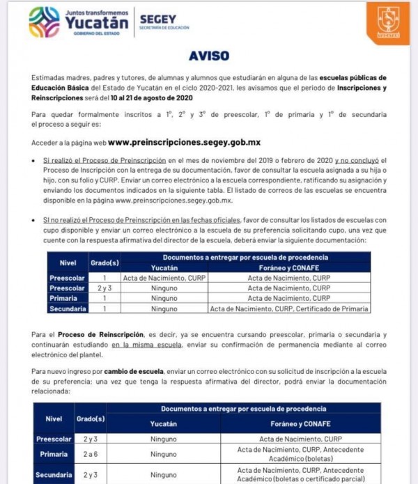La Segey informó que el periodo de inscripciones y reinscripciones será del 10 al 21 de agosto de 2020, a través de línea para que los niños y niñas queden formalmente registrados en las escuelas de la Entidad.