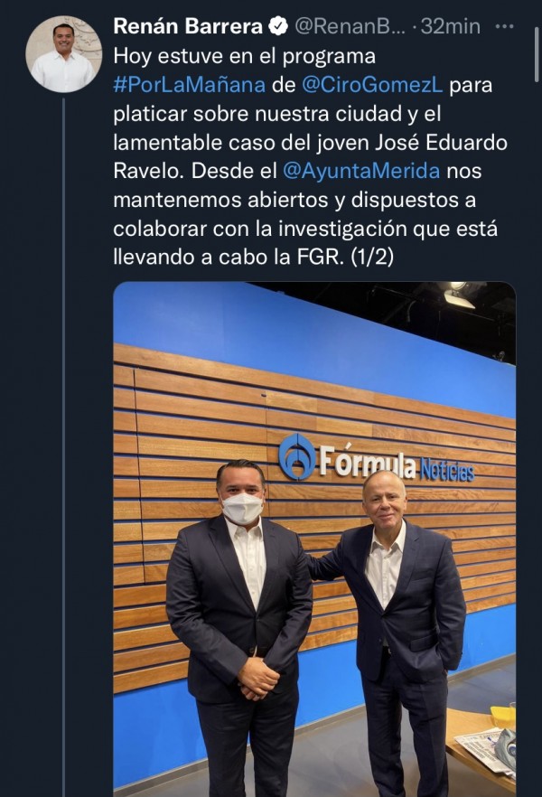 El primer edil de Mérida viajo a la CDMX para una reunión con líderes de su partido (PAN), posteriormente en su cuenta de Twitter escribió que "el lamentable caso del joven José Eduardo Ravelo. Desde el @AyuntaMerida nos mantenemos abiertos y dispuestos a colaborar con la investigación que está llevando a cabo la FGR".